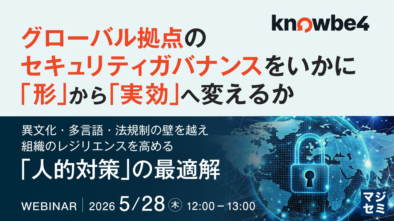 本セミナーでは、世界的なセキュリティ意識向上トレーニングのリーダーであるKnowBe4が、グローバル拠点に実効性のあるガバナンスを効かせるための実践的な手法を解説します。海外拠点を含めたガバナンス強化を求められている方、拠点ごとの取り組みを統制しつつ現場に無理なく定着させたい方、リスクと効果を数値で説明できる状態を作りたい方は、ぜひご参加ください