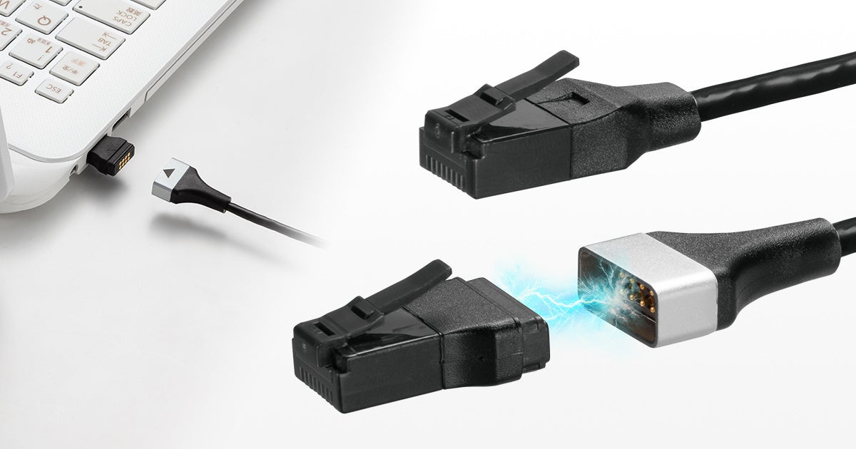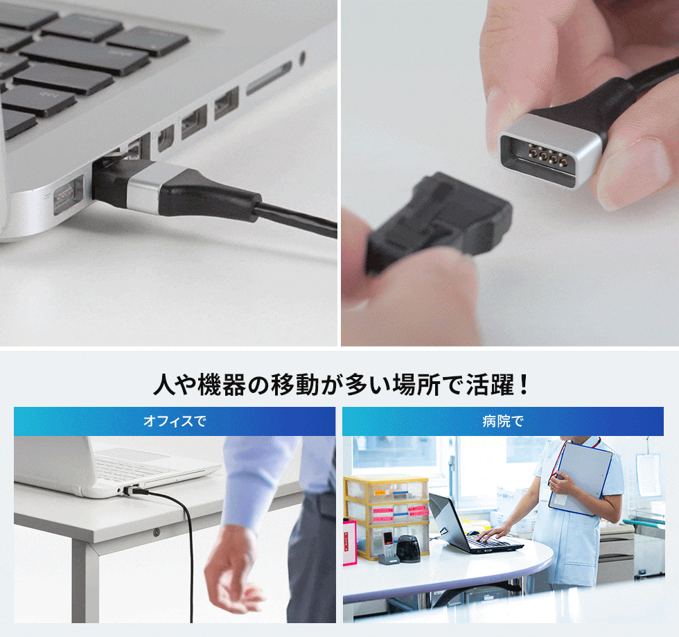 ブレイクアウェイLANケーブルは、ケーブルが引っ張られた際、マグネット脱着式のコネクタからケーブルが分離する構造で、接続機器の落下や損傷、引っ掛けた人の怪我や転倒を未然に防げる新しい発想のケーブルです。オフィスで離席の際や病院の大切な医療機器の移動、人の往来が多い場所での使用に便利です。