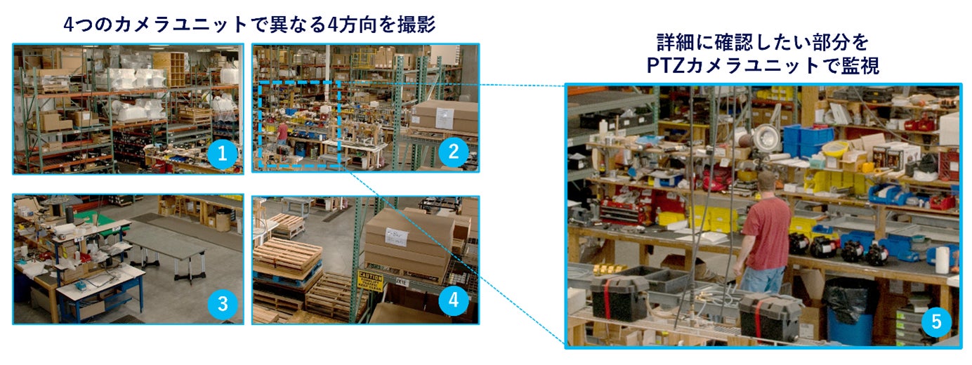 今回取扱い開始するネットワークカメラは、1台の筐体に5つのカメラユニットを搭載し、そのうち、5MP解像度のカメラユニット4つで360°の広域監視と、2MP解像度の21倍光学ズームに対応したPTZカメラユニット1つで被写体の詳細監視を両立します。これにより、1台で行き届いた監視とカメラの台数・設置工数・スペースの削減を実現します。