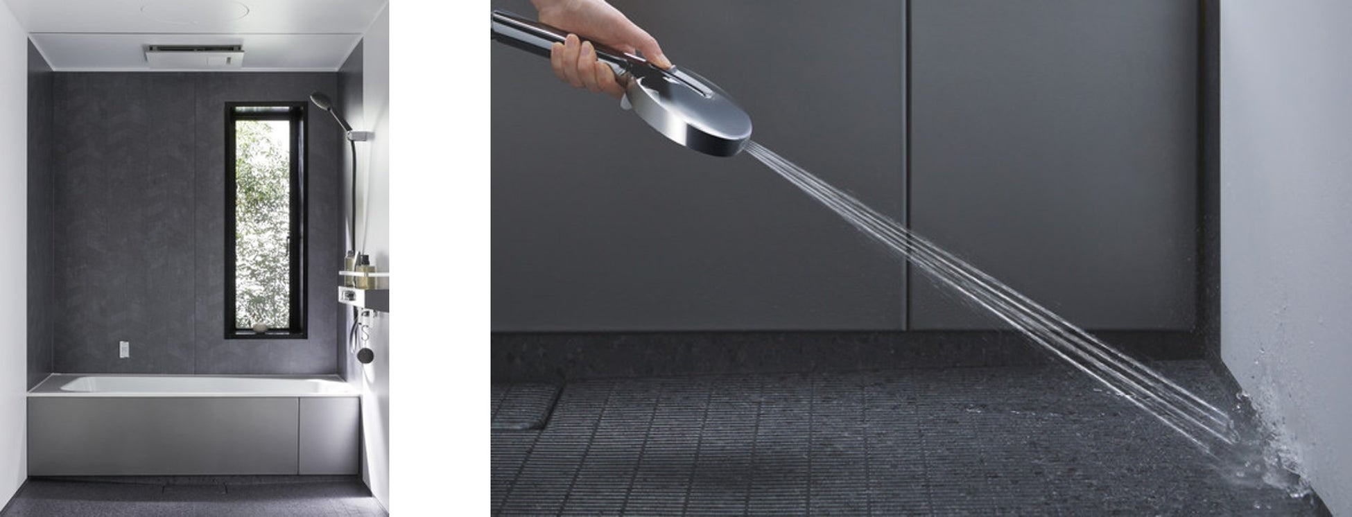 そこで新しいショウルームでは、水まわりの掃除をラクに楽しくする「ラクテク」の最新技術を体感いただけるコーナーを2か所設置。2022年8月に発売したシステムバスの新ブランド「BEVAS(ビバス)」では、通常のシャワーにパワフルなお掃除水流モードを追加した「ビームシャワー」を実体験いただけます。