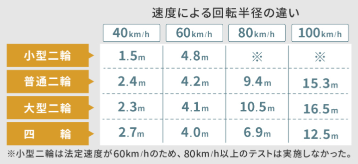 速度が上がるにつれて回転半径が大きくなり、60km/h と比べ80km/h では2 倍以上になった。