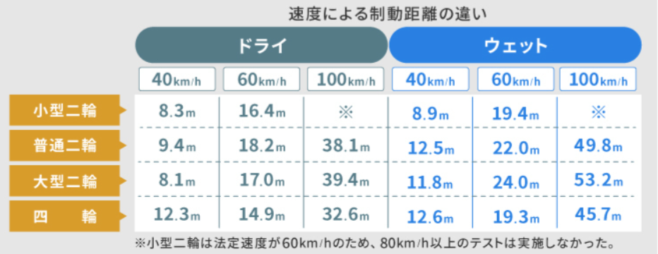 今回の検証で、濡れた路面や速度の上昇によって制動距離が長くなり、80km/h 以上では旋回時に