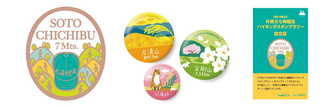 スタンプラリーコースを達成すると、記念缶バッジ(先着3,000個限定、8種)と達成認定証がもらえるほか、山のお土産ブランド「Yamasanka(ヤマサンカ)」とコラボした、人気の特製ピンズ(毎月30個抽選)に応募することができます。