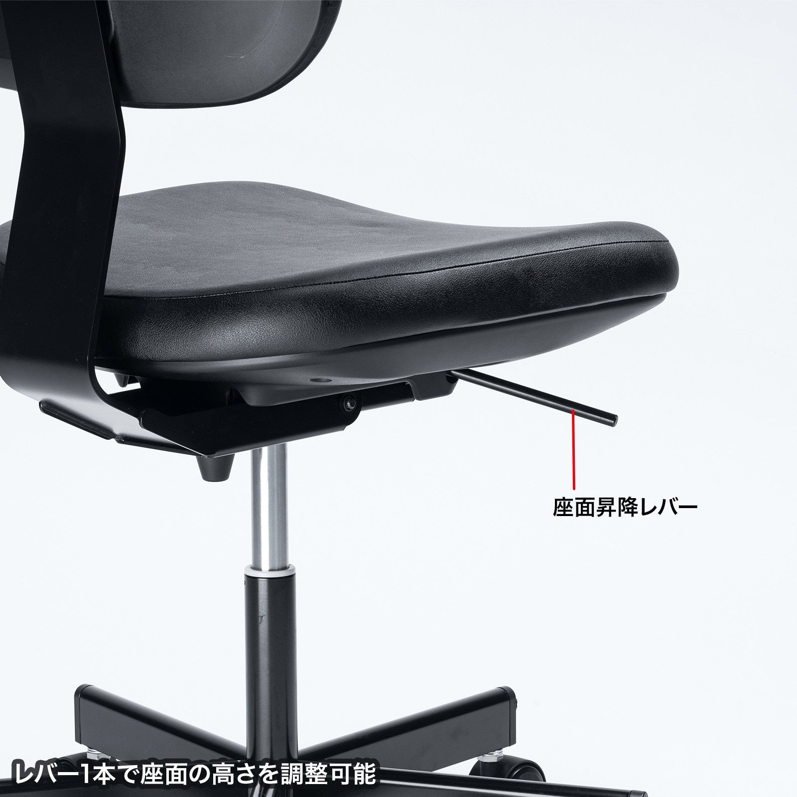 レバー1本で座面をお好みの高さに調整できる、ガス圧リフト装置付きです。座高は最低420mmまで下げることができるため、小柄な方でも快適にお使いいただけます。