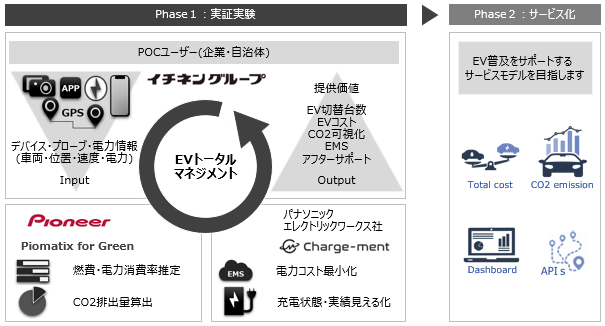 さらに、イチネンテレマティクス(※1)や本実証実験用のスマホアプリから取得する車両・走行データを、パイオニアのルート最適化技術とエネルギー効率推定技術(燃費/電力消費率)を活用したクラウドプラットフォーム「Piomatix for Green」(※2)と組み合わせ、EVの最適導入台数の算出やエネルギーコストの比較、CO2排出量の見える化などのフリートマネジメントを行うEV導入シミュレーションサービスを構築し、EVトータルマネジメントソリューションとして、EVの導入を検討している企業や自治体向けに提供する予定です。