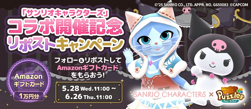 「モンスターハンターパズル アイルーアイランド」公式X (@MHPuzzles)をフォローし、 キャンペーン期間中に指定されたポストをリポストした方から抽選で10名様に1万円分のAmazonギフトカード(デジタルギフト)をプレゼントいたします。