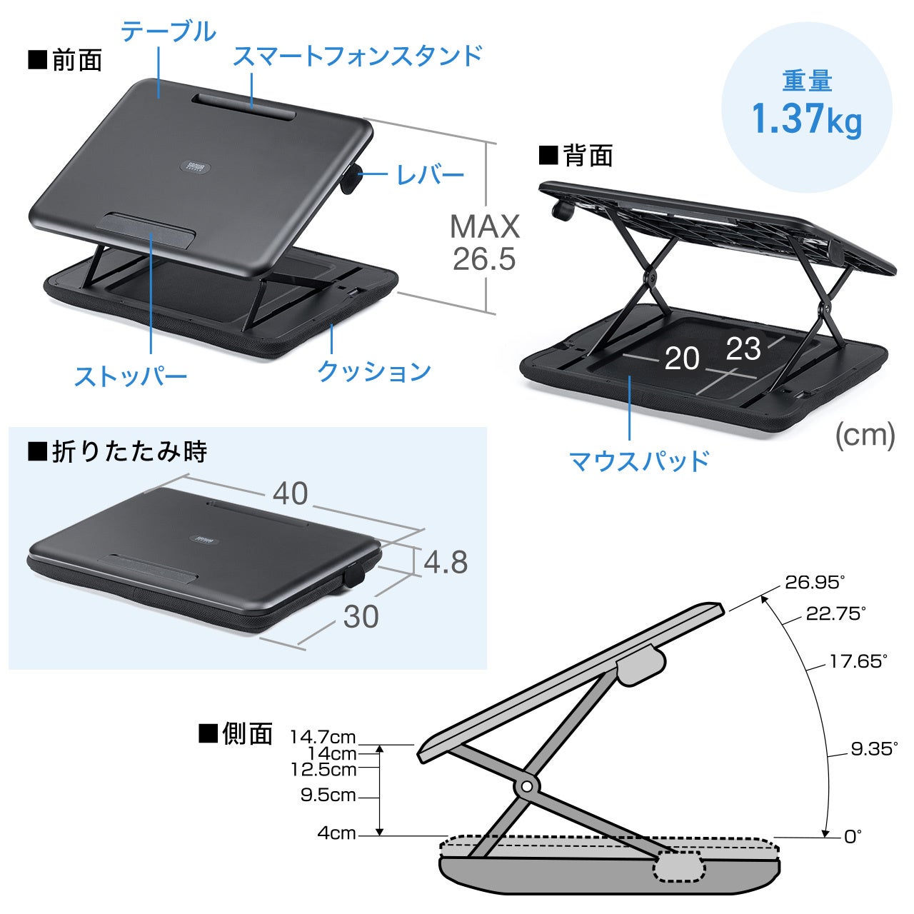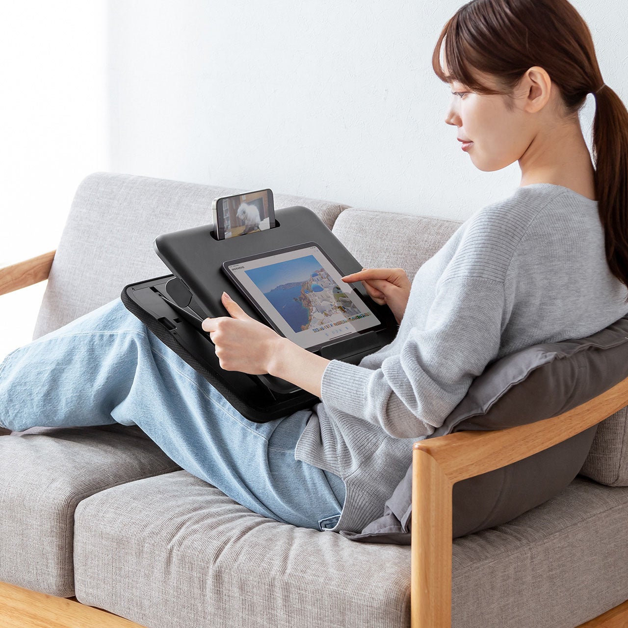 目線が上がり姿勢がよくなるように高さを5段階で変更が可能で、テーブルの他にマウスパッドやタブレットスタンド、ストッパーなどが付いている膝上テーブル