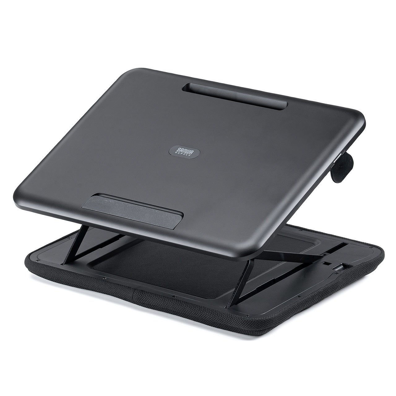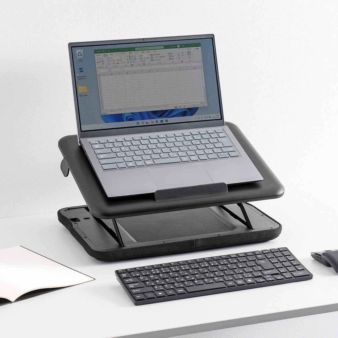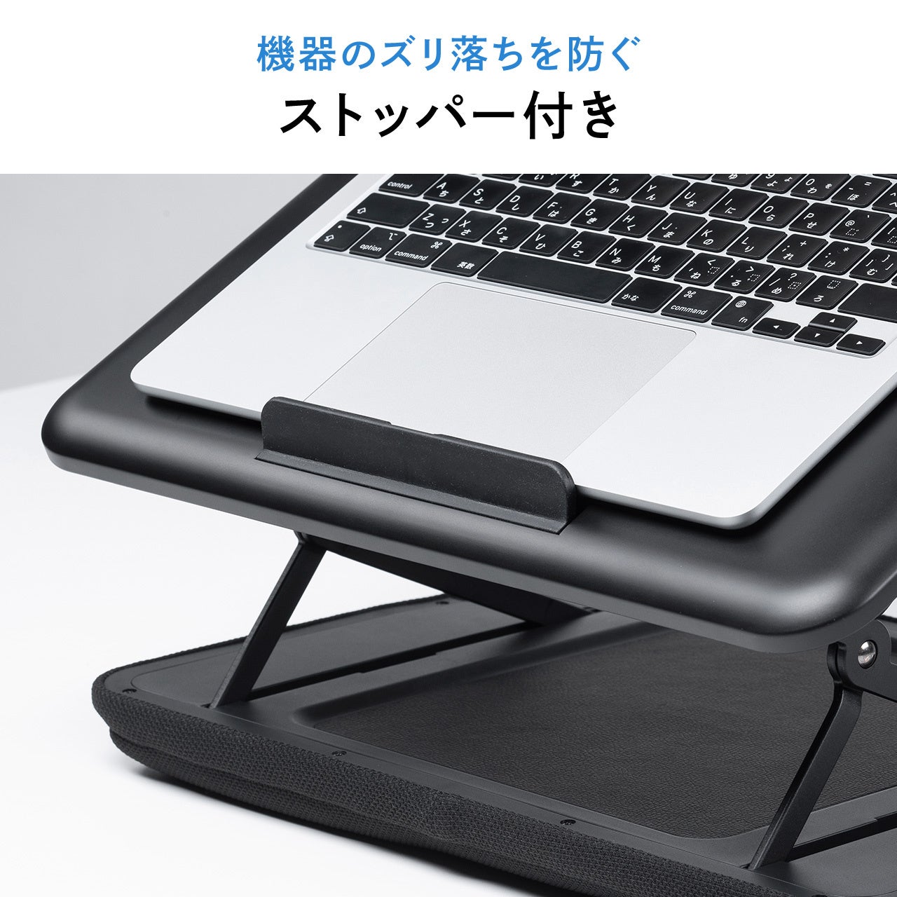 ノートパソコンやタブレットが滑り落ちるのを防ぐストッパーが付いているため、安心して使用できます。また、15.6型までのノートパソコンに対応しているので、様々な機種で利用可能です。安定して作業ができるので、集中力も持続します。