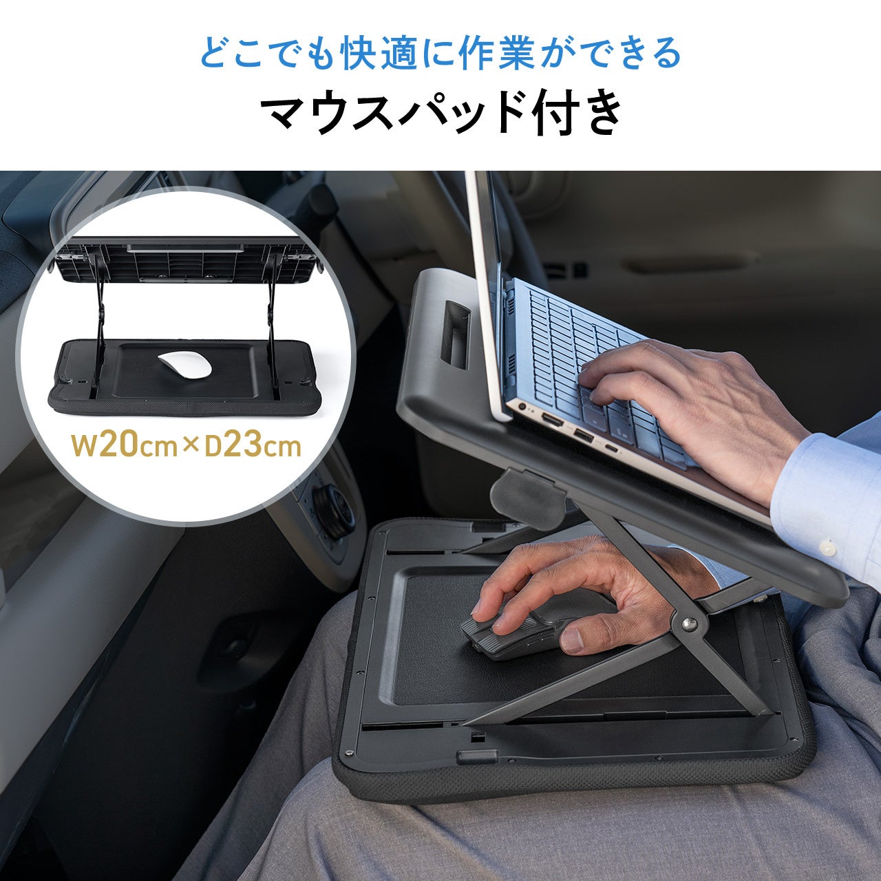 狭い車内などでパソコン作業を行う場合、この膝上テーブルがあれば、マウスパッド付きのためマウスを使って快適に作業ができます。マススを使うスペースがない場所でも快適にパソコン作業が可能です。