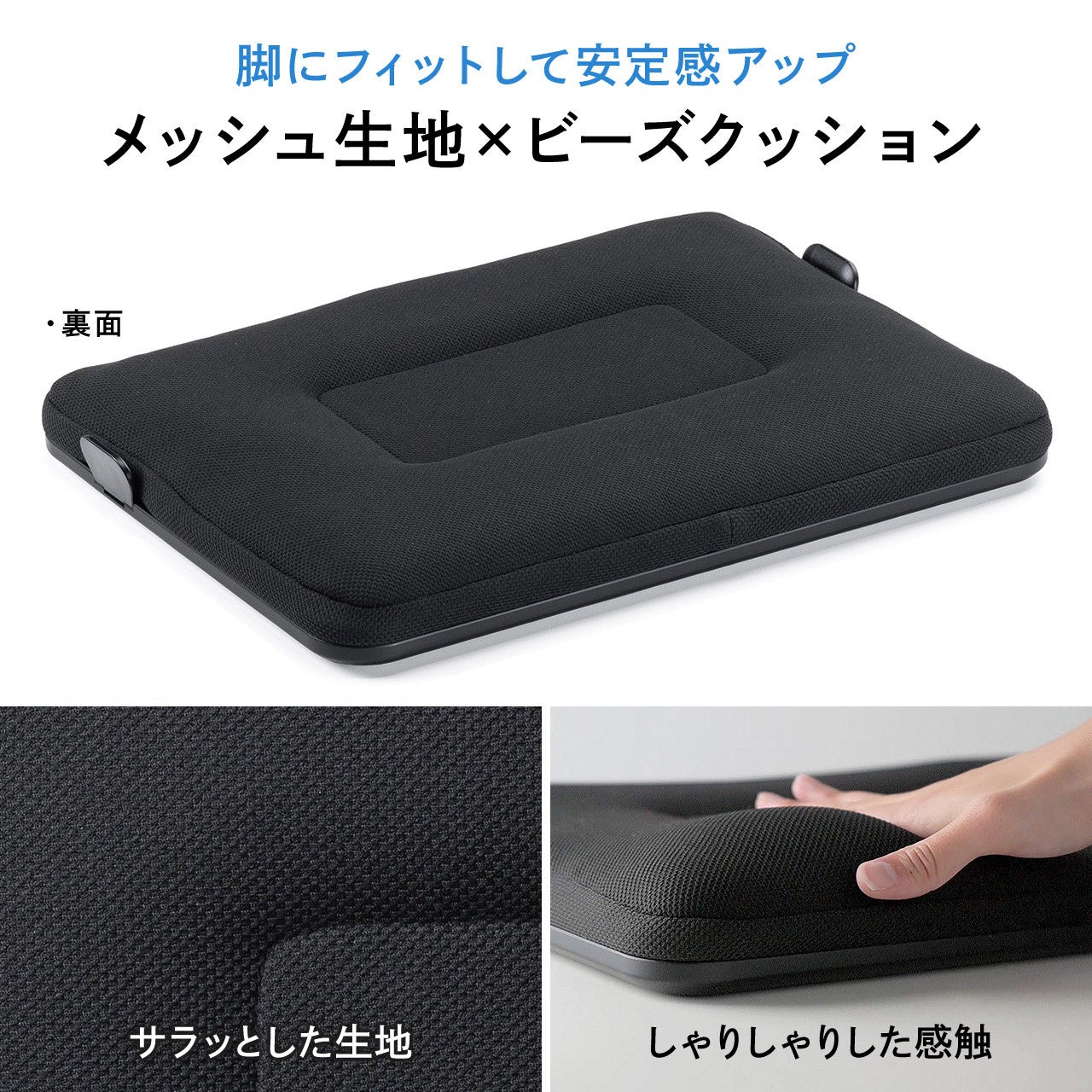膝上テーブルの裏面は、メッシュ生地のビーズクッションがついております。触り心地がよく、膝上に置いた際に足にフィットしてずれにくいため、膝上テーブルで安心して作業ができます。