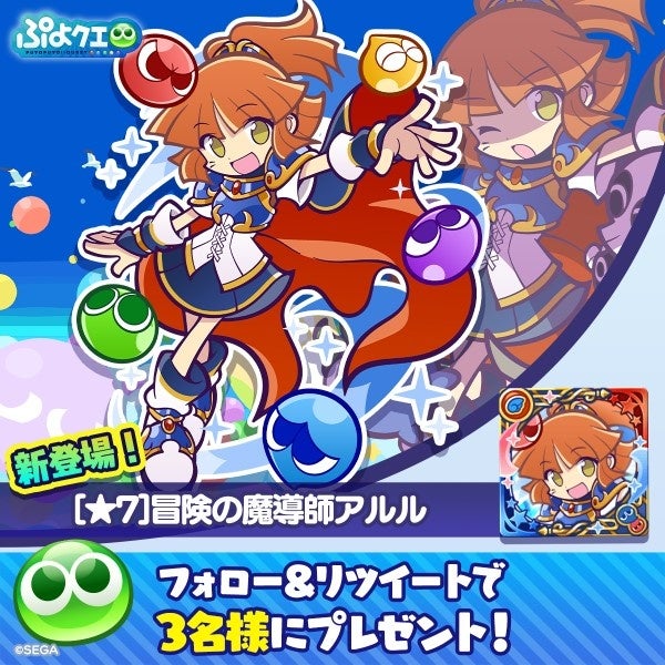 内容:『ぷよぷよ!!クエスト(ぷよクエ)』公式Twitterアカウント(https://twitter.com/puyoquest)をフォロー&対象のツイートをリツイートすると、抽選で3名様に「[★7]冒険の魔導師アルル」をプレゼントするキャンペーンを開催中です。ぜひご参加ください!
