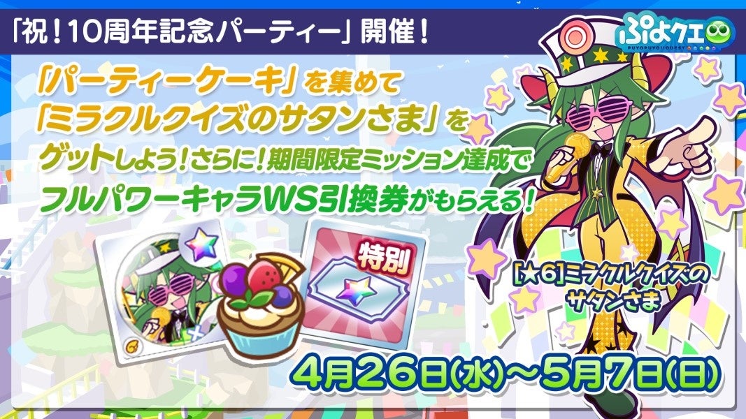 株式会社セガは、本日2023年4月24日(月)で大好評配信中のパズルRPG『ぷよぷよ!!クエスト』が10周年を迎えたことをお知らせします。4月24日(月)より、「10周年記念 無料100連ガチャ」や「ミラクルクイズのサタンさま」を獲得できるイベント「祝!10周年記念パーティー」など、豪華イベントが盛りだくさんの「ぷよクエ10周年記念キャンペーン」を開催します。
