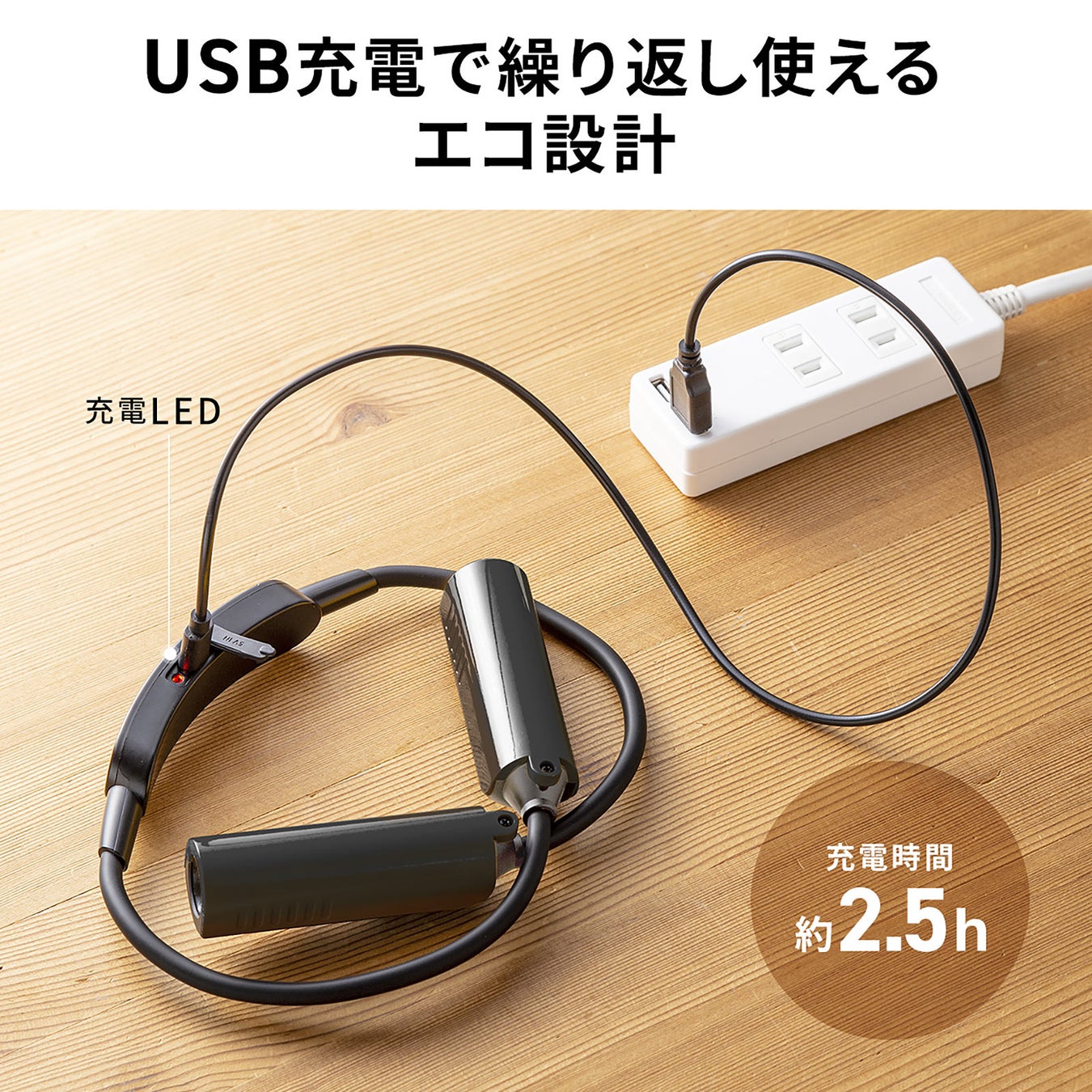 ネックライト 首掛け式LED USB充電式 作業用ライト 防水規格IP44 最大120ルーメン フレキシブルアーム ブラック