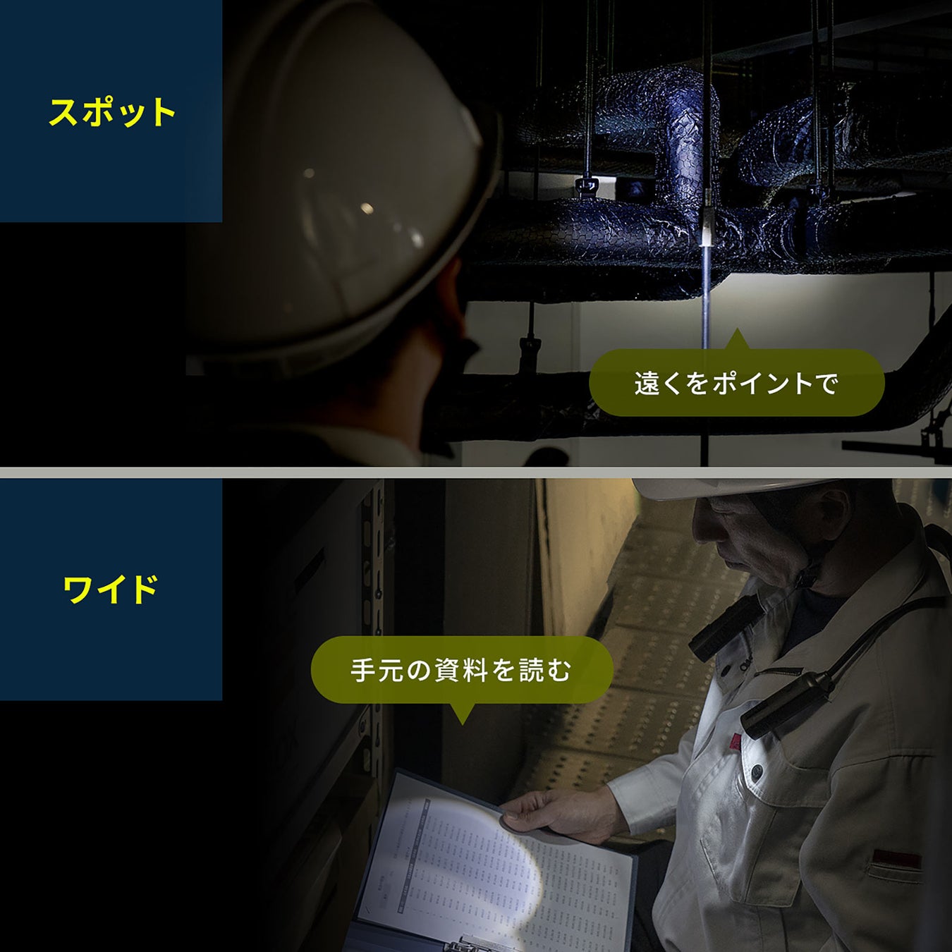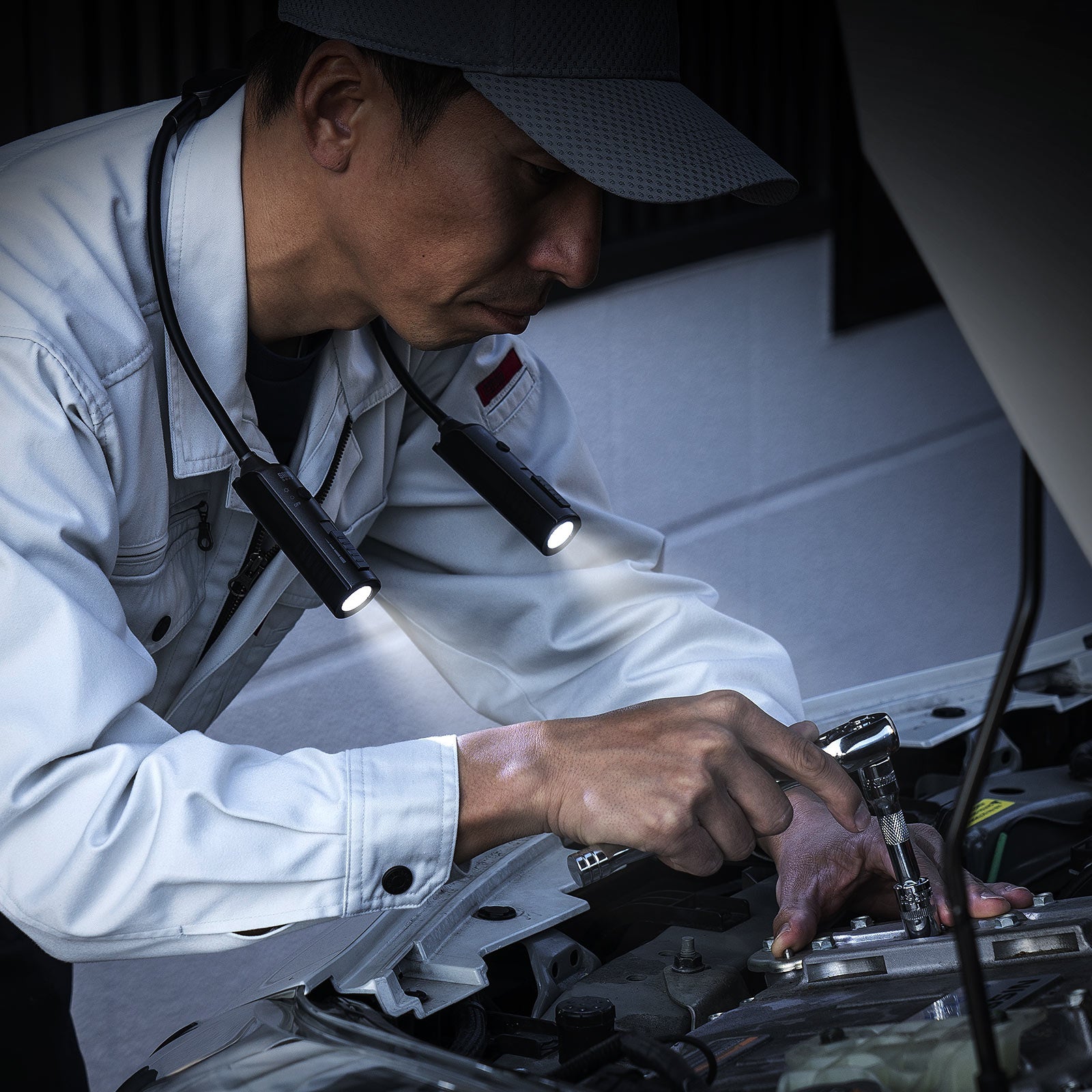 左右独立して調整可能なフレキシブルアームが特徴です。スポットとワイドの切替ができ、必要な場所だけをピンポイントで照らせるので、効率的に作業を進められます。作業台やキャンプでの細かな作業に最適です。