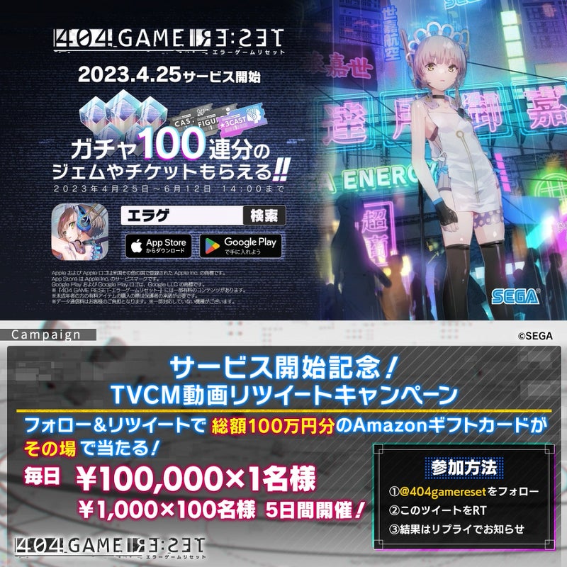 『エラーゲームリセット』公式Twitter( https://twitter.com/404gamereset )をフォローし、キャンペーン対象ツイートをRTすることで応募完了となります。応募条件を満たした方の中から抽選で総額100万円分のAmazonギフトカードがその場ですぐにプレゼントされます。ぜひ、ご参加ください。