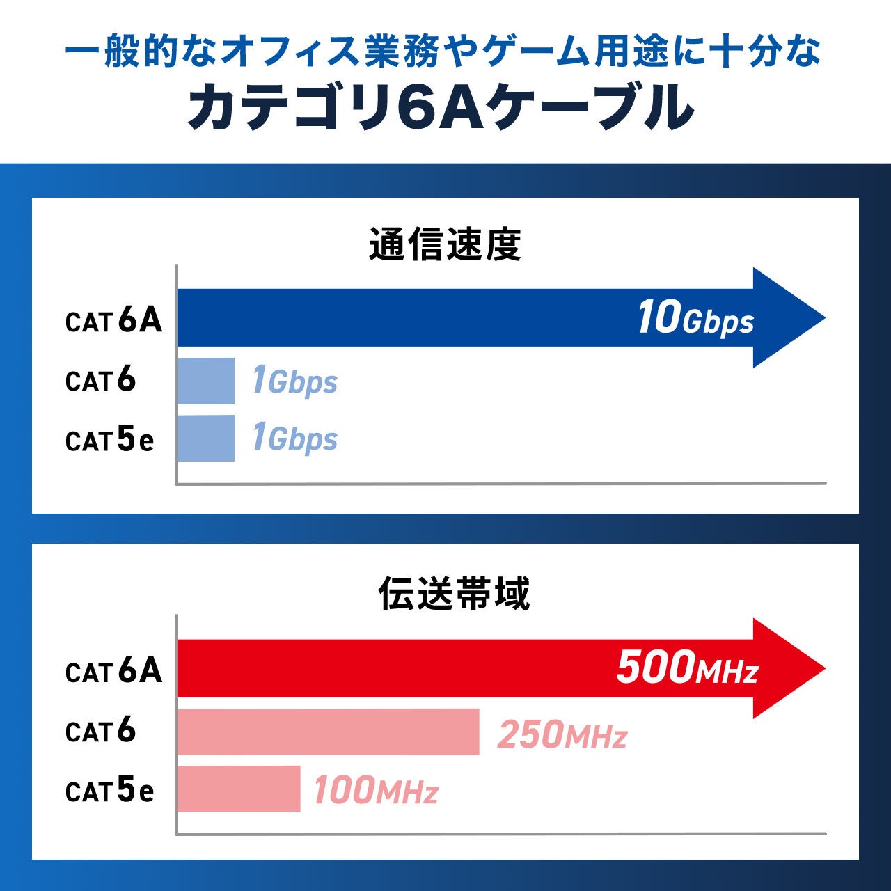 次世代の高速通信規格、10ギガビット・イーサネット(10GBASE-T)に対応したカテゴリ6A規格のLANケーブル。広い伝送帯域500MHzを誇り、高速で安定したデータ通信を実現します。