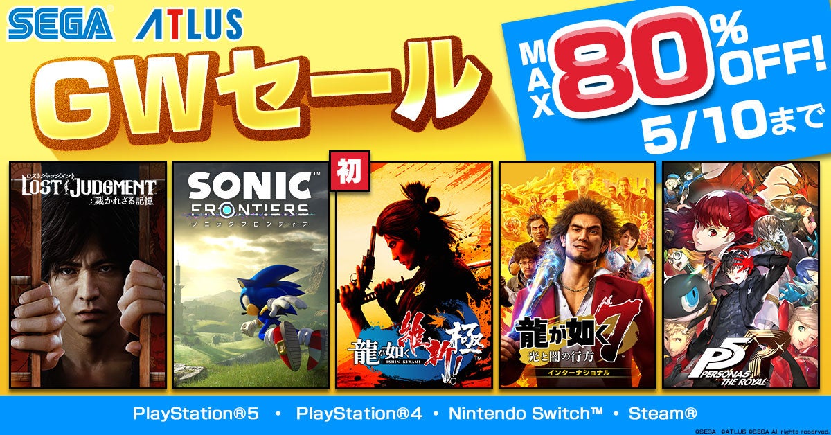 株式会社セガは、PlayStation™Storeおよびニンテンドーeショップ、Steamにて販売中の一部PlayStation®5/PlayStation®4/Nintendo Switch™/PC(Steam)用タイトルを対象とし、期間限定で特別価格にて販売する「セガ GWセール」を開催中です。