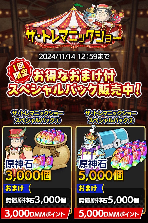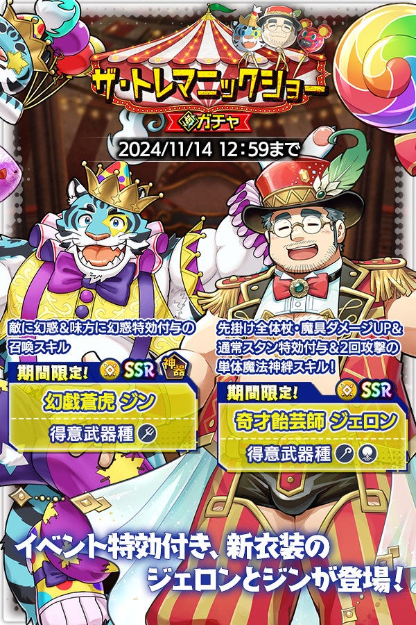 さらに、SSR魂友「奇才飴芸師 ジェロン」とSSR神器「幻戯蒼虎 ジン」が入手可能な期間限定の「ザ・トレマニックショー」ガチャも登場!