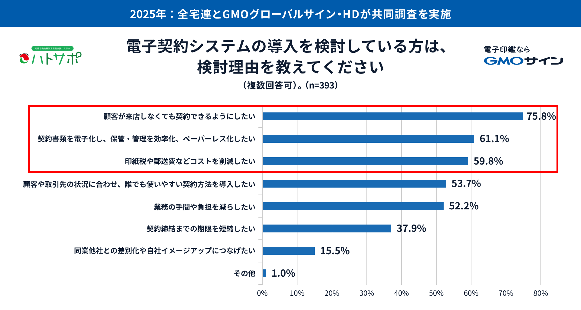 検討理由の第1位は「顧客が来店しなくても契約可能にしたい」(75.8%)、第2位は「保管・管理の効率化、ペーパーレス化」(61.1%)、第3位は「コスト削減」(59.8%)となっています。
