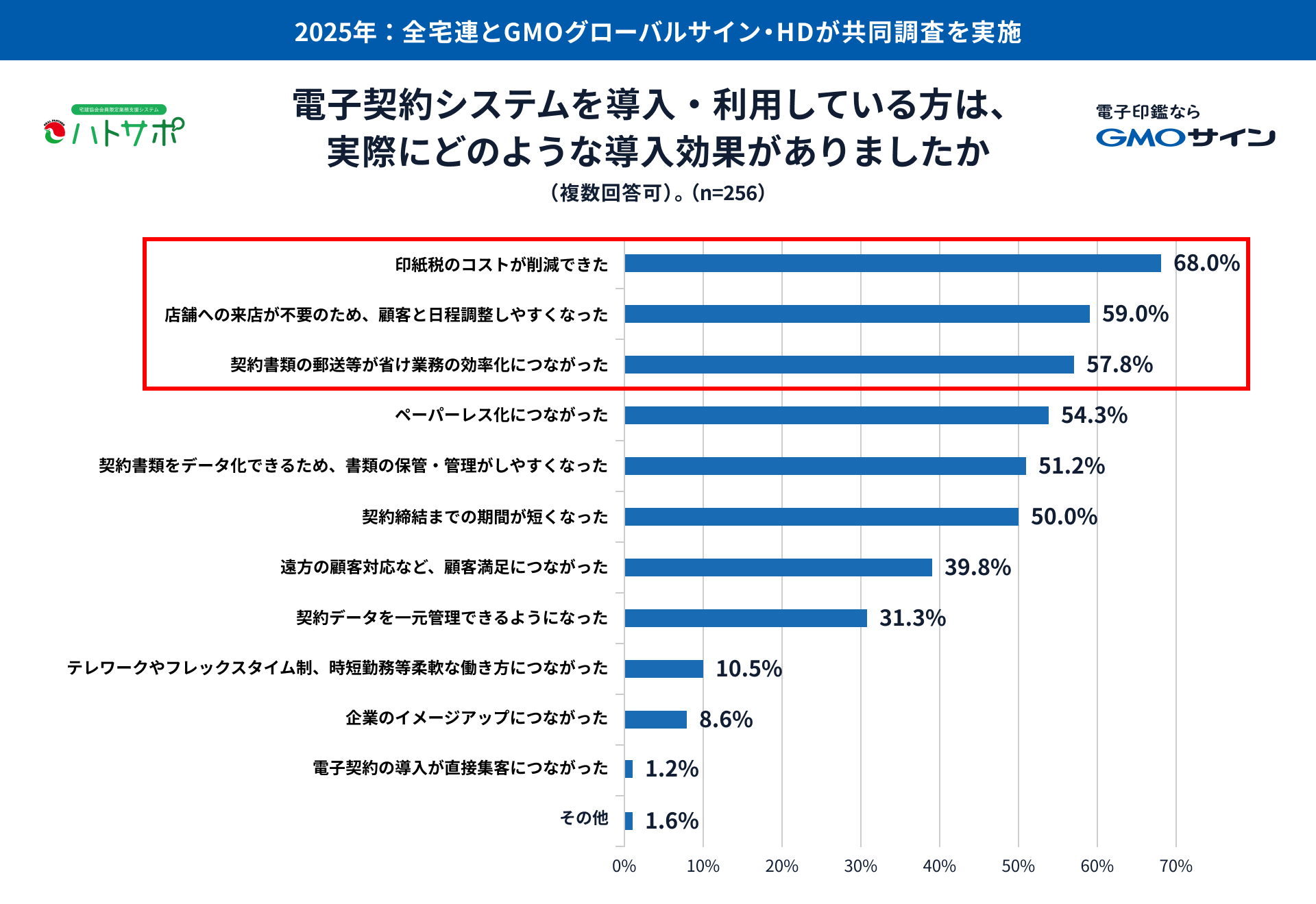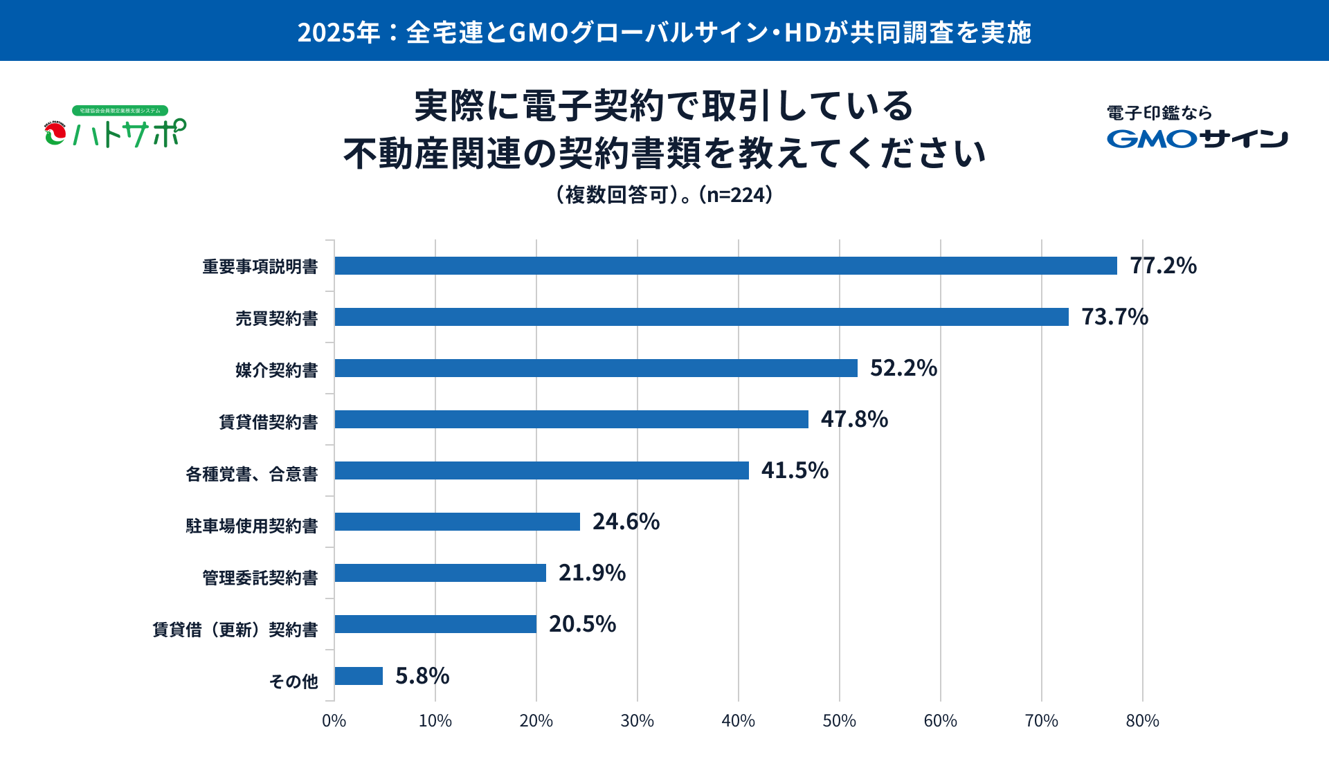 電子契約サービス「電子印鑑GMOサイン」を提供するGMOグローバルサイン・ホールディングス株式会社(代表取締役社長:青山 満 以下、GMOグローバルサイン・HD)と、宅建協会会員業務支援サイト「ハトサポ」を運営する公益社団法人全国宅地建物取引業協会連合会(会長:坂本 久 以下、全宅連)は、このたび、不動産事業者を対象に不動産取引における電子契約の実態に関する共同調査を実施しました。GMOグローバルサイン・HDと全宅連による共同調査は2023年にも実施されており、今回で2回目となります(※1)。2022年5月に施行された改正宅地建物取引業法(以下、改正宅建業法)により、不動産取引における電子契約の利用が可能となってから3年以上が経過しました。本調査を通じて、不動産取引における電子契約の利用状況や課題についての実態が判明しました。
