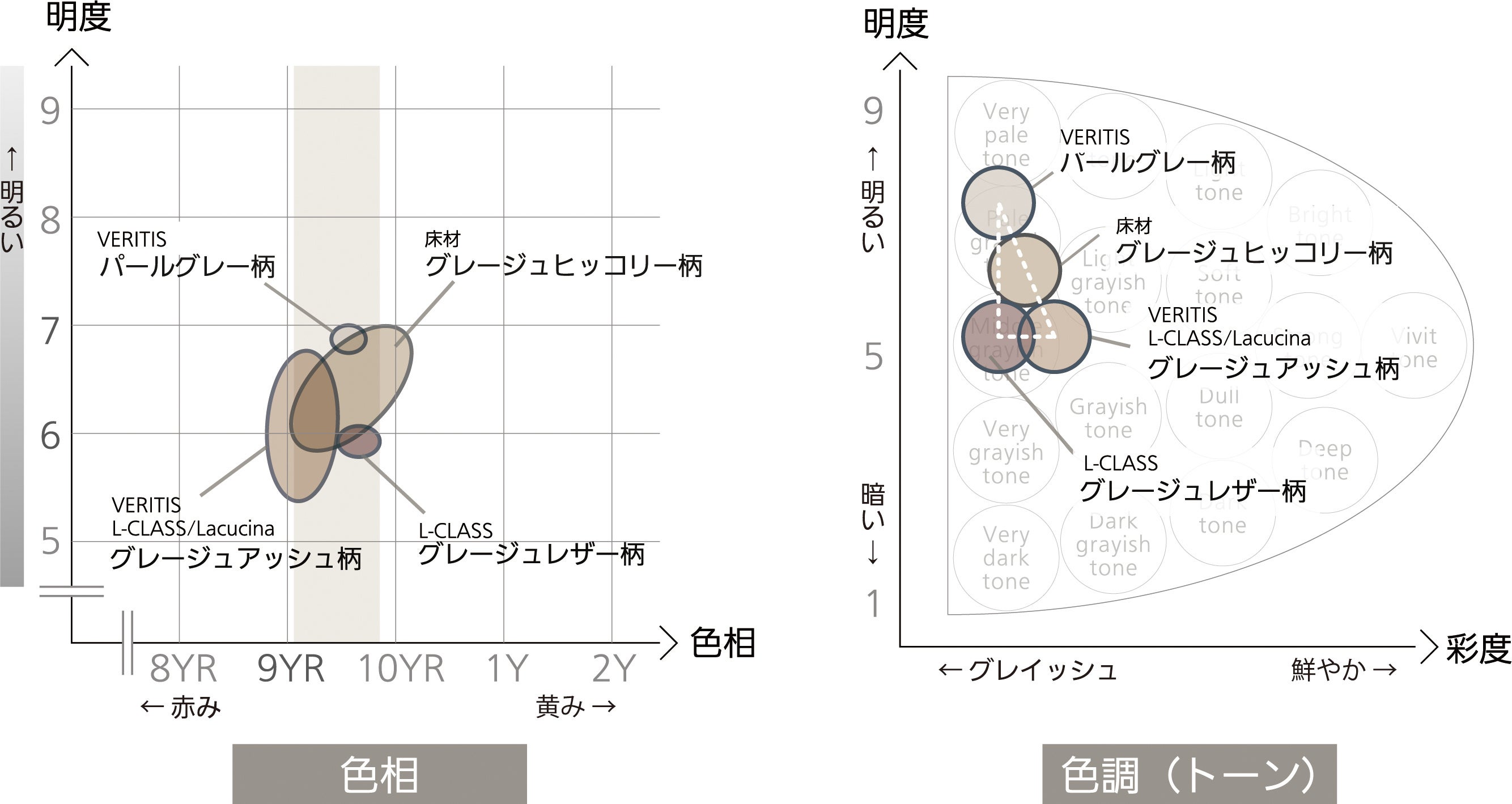 2022年2月に発売したインテリア建材「ベリティス」の「グレージュアッシュ柄(※2)」「パールグレー柄」、2022年8月に発売したLクラスキッチンの扉柄「グレージュレザー柄」、そして、2023年4月3日に発売した床材の色柄「グレージュヒッコリー柄」は、見た目の印象は異なりますが、実は、“同じ色相(色み)”になるよう開発した色柄です。