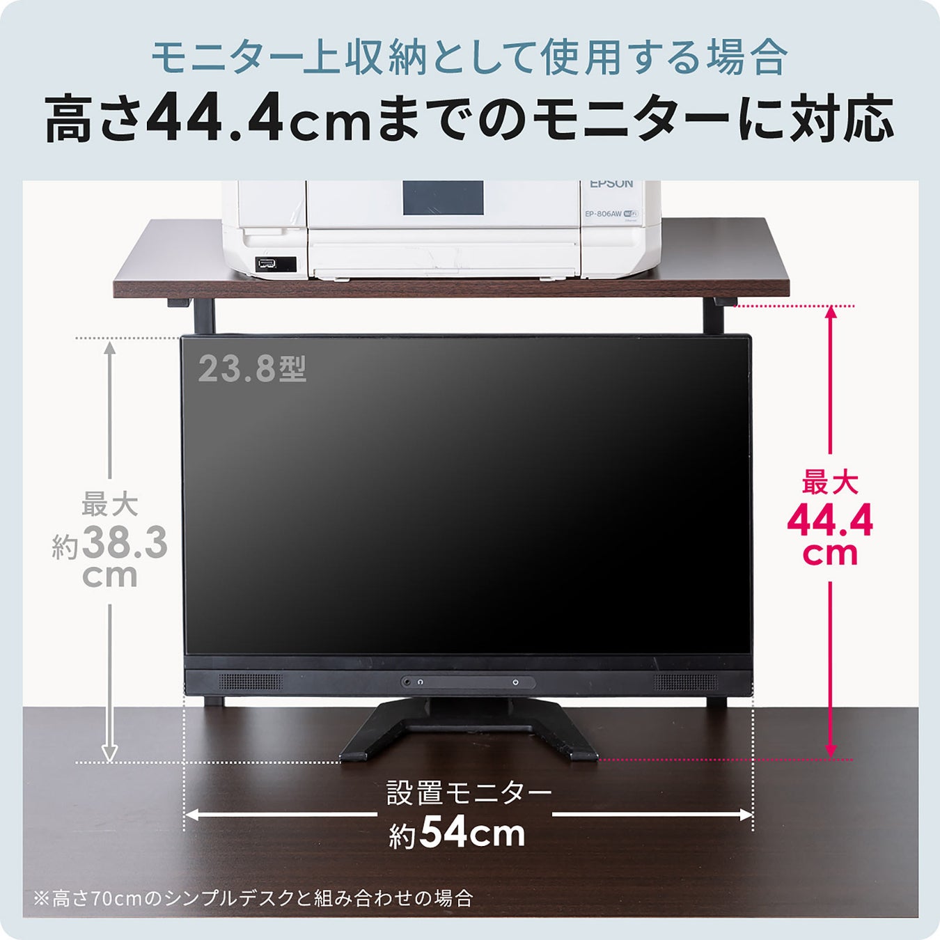 このサブテーブルは総耐荷重10kgです。さらにたっぷり載せられる大きめ天板を採用しているので、モニターやプリンタ、スピーカーなど重量のある機器を安心して設置可能です。
