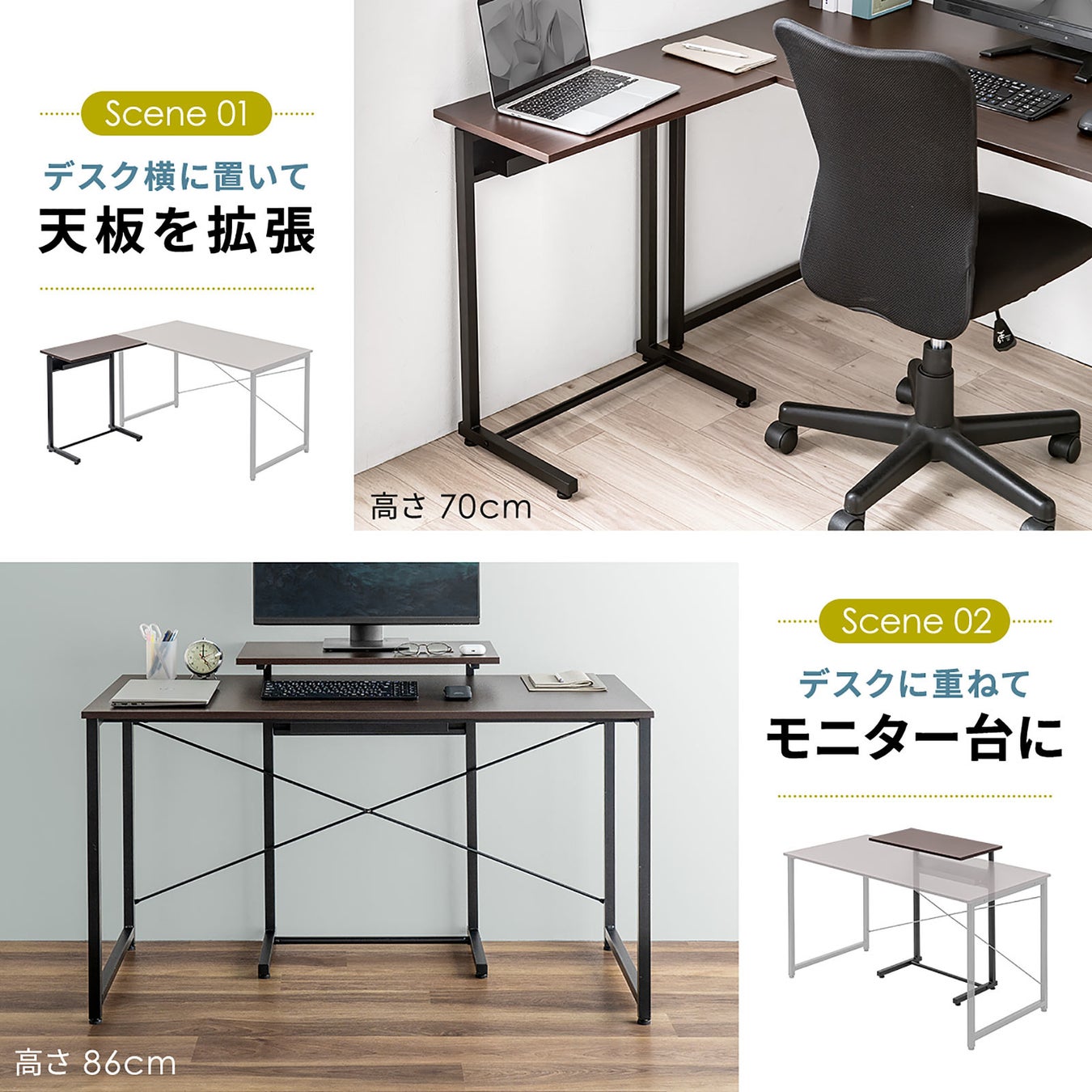 このサブテーブルは、シンプルなデスクや既存の作業スペースを広げるのに最適です。追加の作業台としても、モニターやプリンタの設置台としても活用可能。どんなデスクにも馴染むブラウンカラーとシンプルなデザインが特徴です。