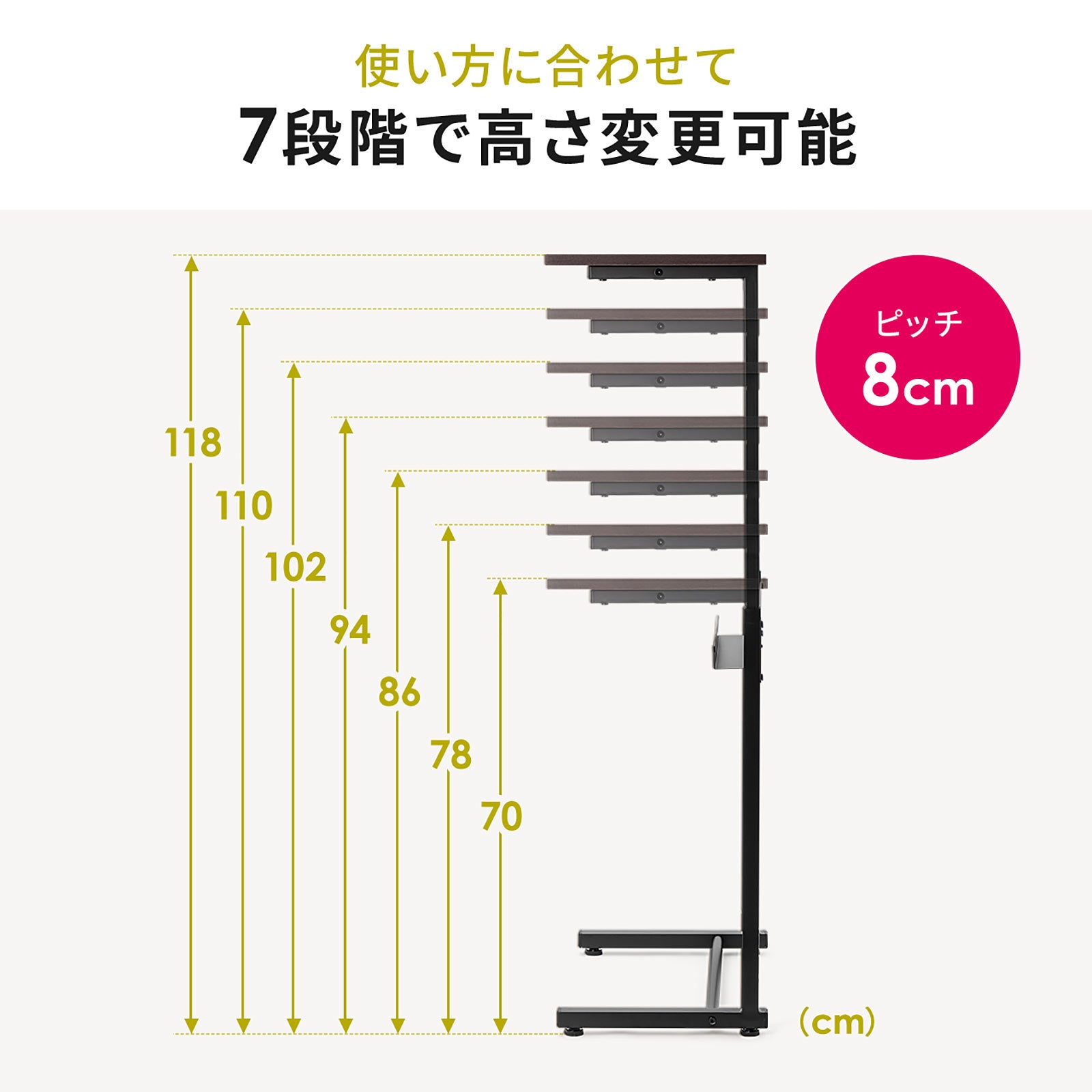 70cmから118cmまで7段階で高さ調整が可能で作業効率を向上させることができます。使う人や用途に合わせて柔軟に調整できます。