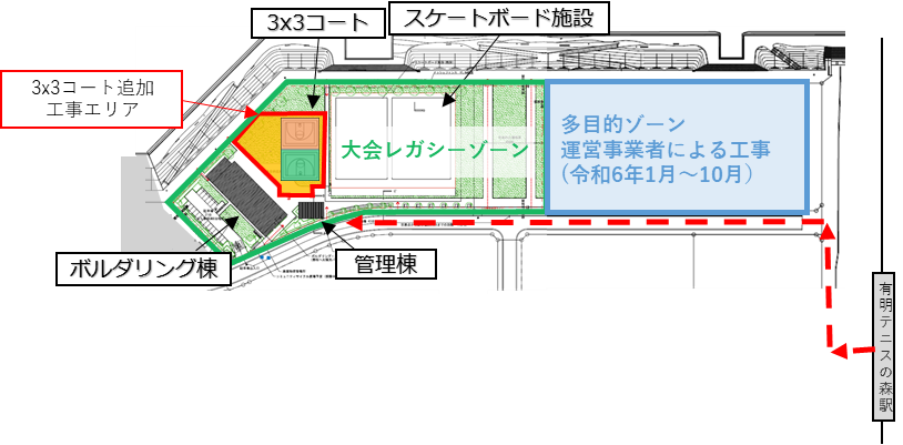 (2)7月26日(金曜日)~9月8日(日曜日)(週6日、金曜日定休):スケートボード施設、ボルダリング棟、3x3コート(いずれも予約制)