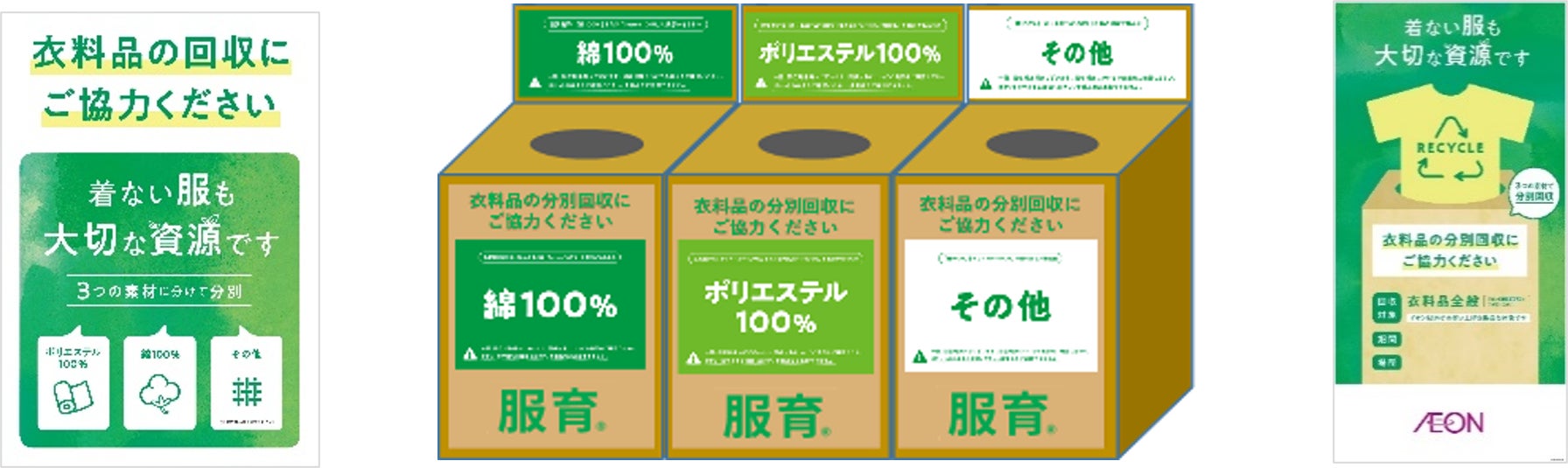 イオンリテールでは5月23日(金)~6月1日(日)まで、「イオン」「イオンスタイル」約290店舗の衣料品売り場に回収ボックスを設置し、不要になった衣料品をポリエステル100%、綿100%、その他の3つにお客さまご自身に分けていただく分別回収を実施します。