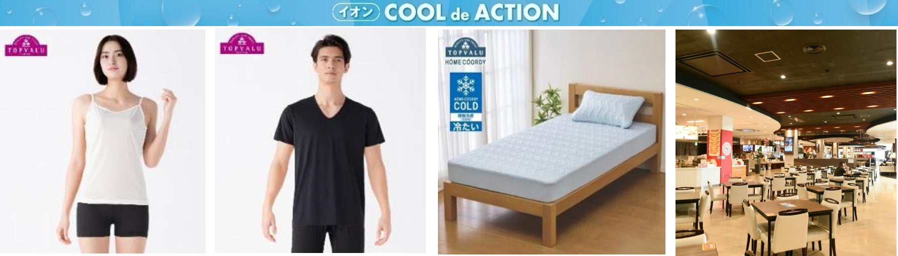 猛暑を涼しく、かっこよく過ごすことをテーマにした取り組み、「イオン COOL de ACTION」と連携し、接触冷感ウエア「ピースフィットクール」や寝具・インテリア商品「ホームコーディコールド」など、機能性とデザイン性を両立した猛暑対策アイテムを4月から長期展開するほか、イオン独自の涼しい休憩スポット「イオンのクールスポット」を開設しています。