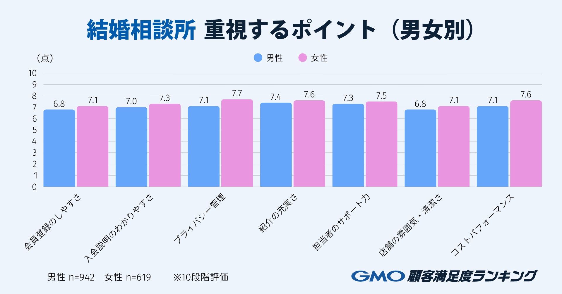 「結婚相談所」を選ぶ際に重視したポイントについて、各項目を10段階で評価する形式で調査しました。男女間、項目間で大きな差異は見られませんでしたが、ほぼすべての項目で女性の方が男性よりも数値が高く示され、サービス選択に対する意識の高さがうかがえます。また、男女ともに「紹介の充実さ」「担当者のサポート力」の点数が比較的高く、成婚につながるサービスの質が共通して重視されていることがわかります。