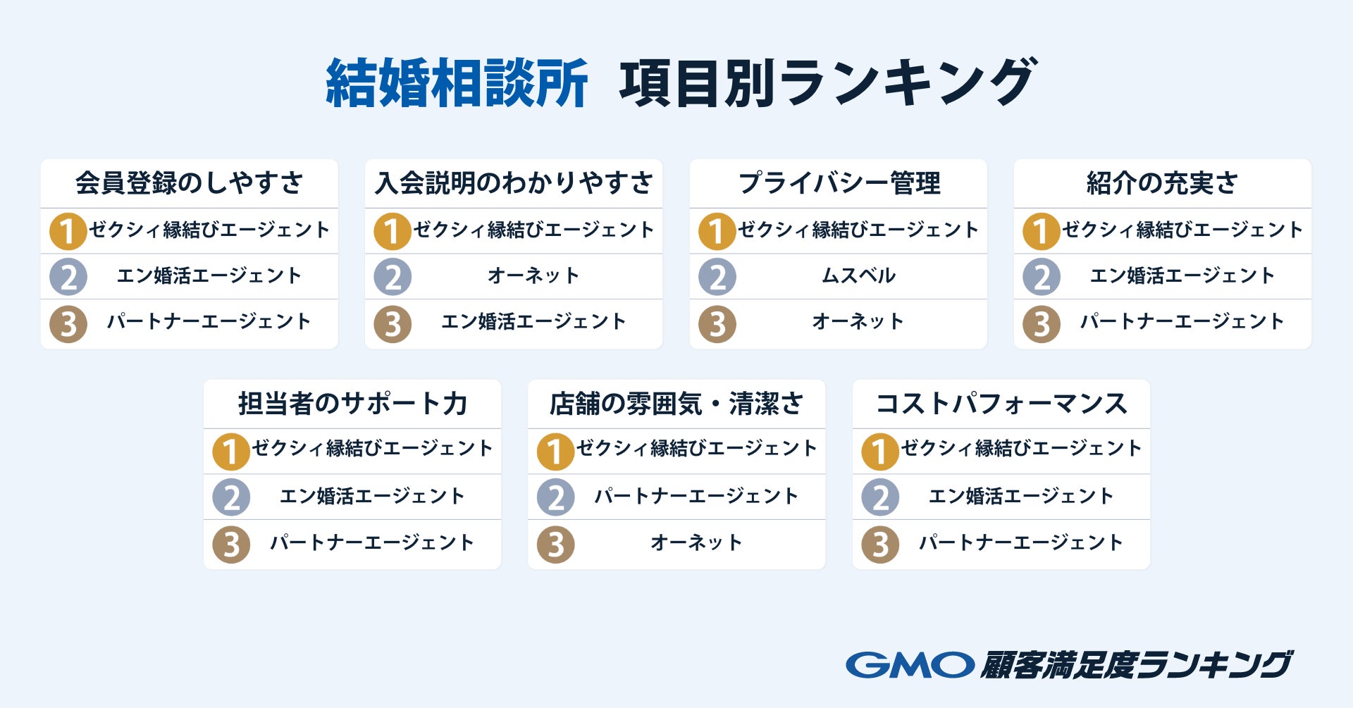 総合ランキング首位のゼクシィ縁結びエージェントが7つの項目別ランキングすべてで1位を獲得し、他の追随を許さない実力を示しました。