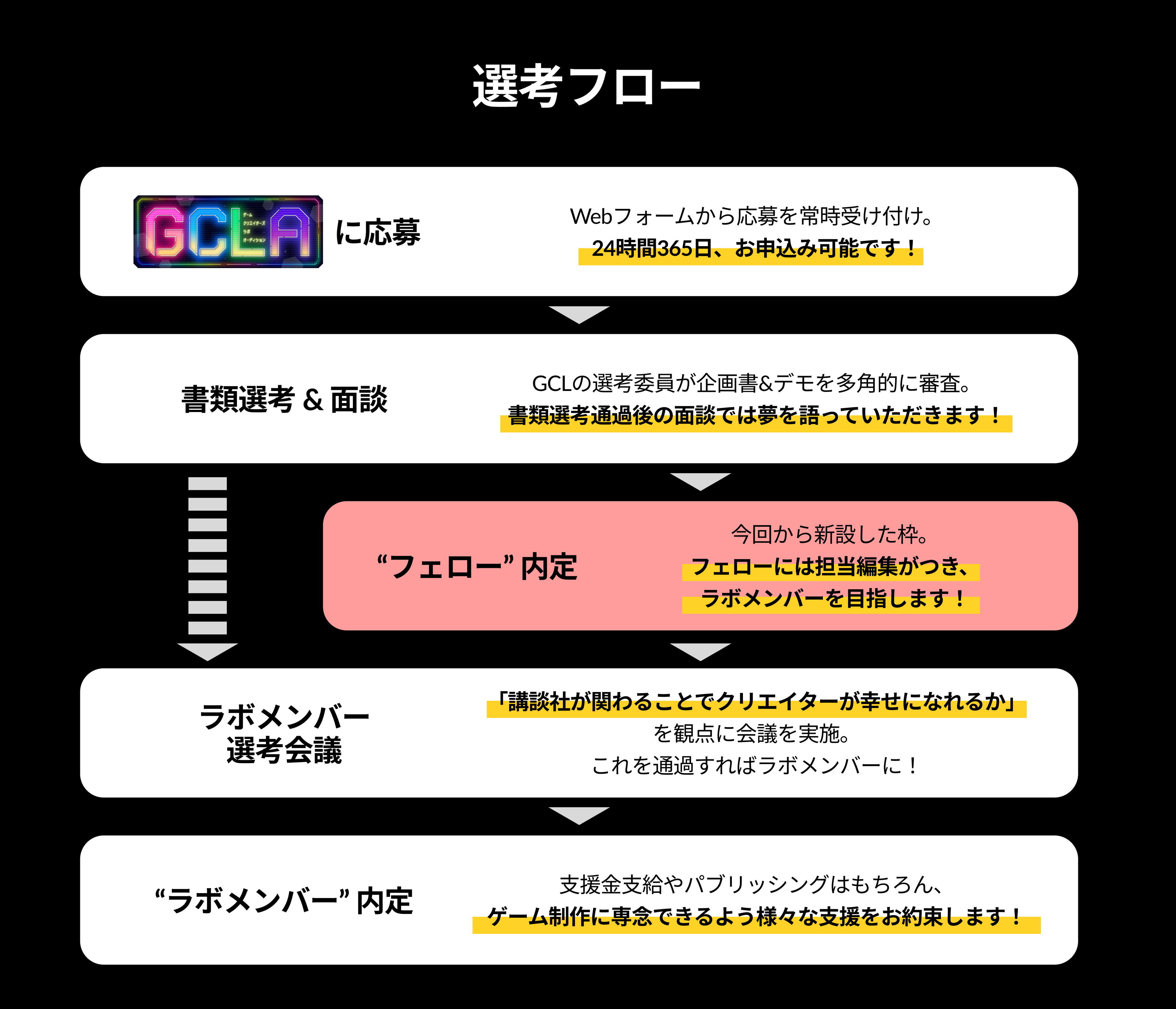 ゲームクリエイターズラボオーディション(GCLA)を「常時募集」へと変更し、