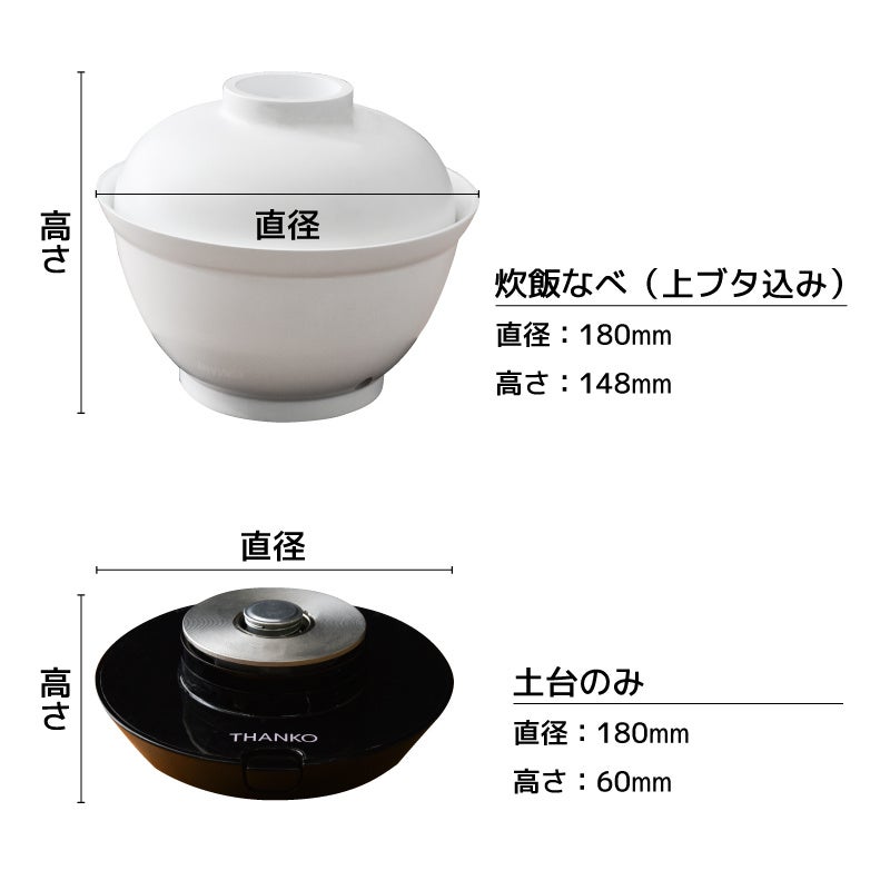 サイズ:炊飯なべ(上ブタ込み)直径180×高さ148(mm)、土台のみ直径180×高さ60(mm)