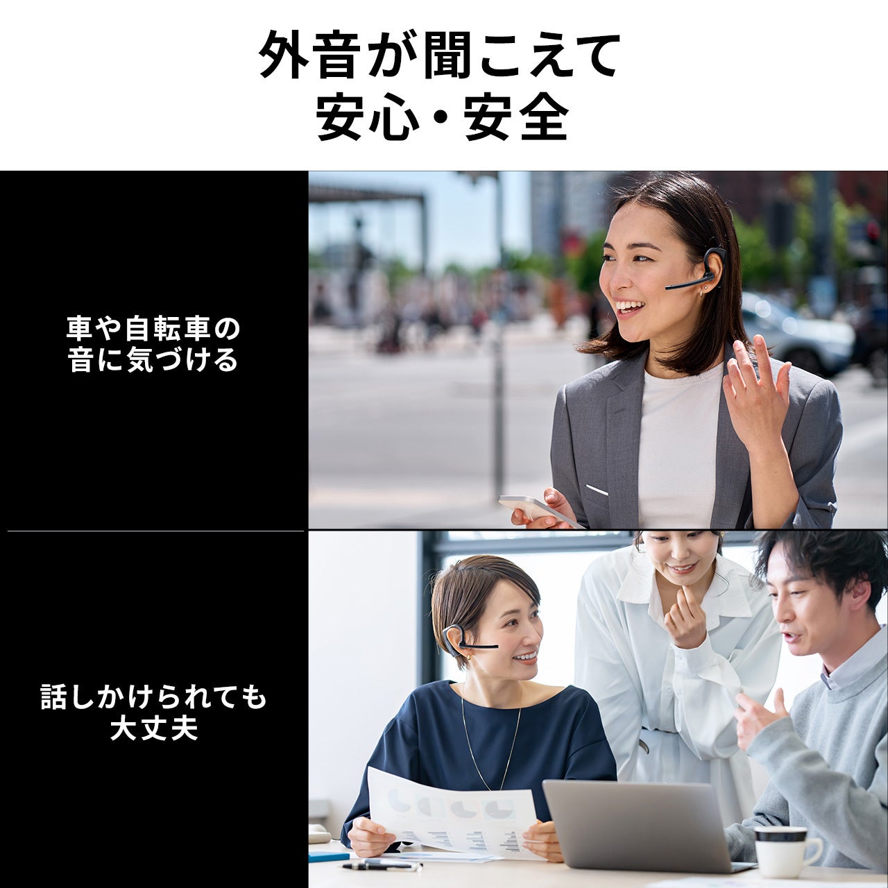 ●耳を塞がないオープンイヤー型なので外音が聞こえて安心・安全