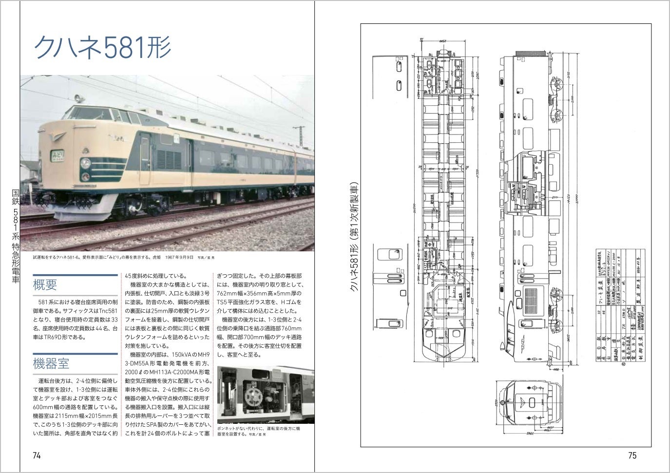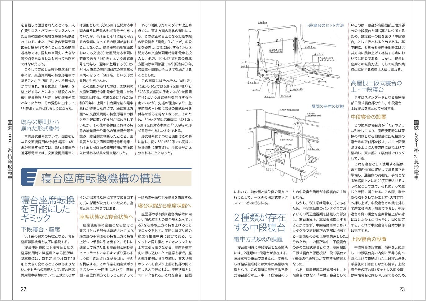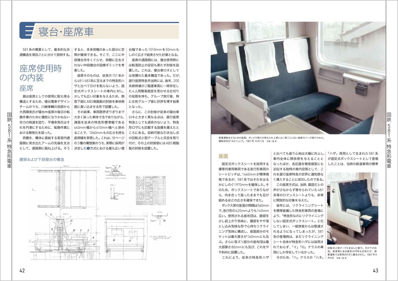 「寝台座席両用電車の構想から開発・落成まで」に重点を置いた構成なので、581系が国鉄で初めて採用した寝台座席両用の機構と、先頭部の貫通構造を中心に、特徴ある構造を図面や写真を多用して詳しく解説しています。581系の写真には、日本国有鉄道の車両設計事務所で、主任技師として本形式開発の陣頭指揮にあたった星晃氏(故人)が撮影された貴重な写真の数々をご提供いただきました。