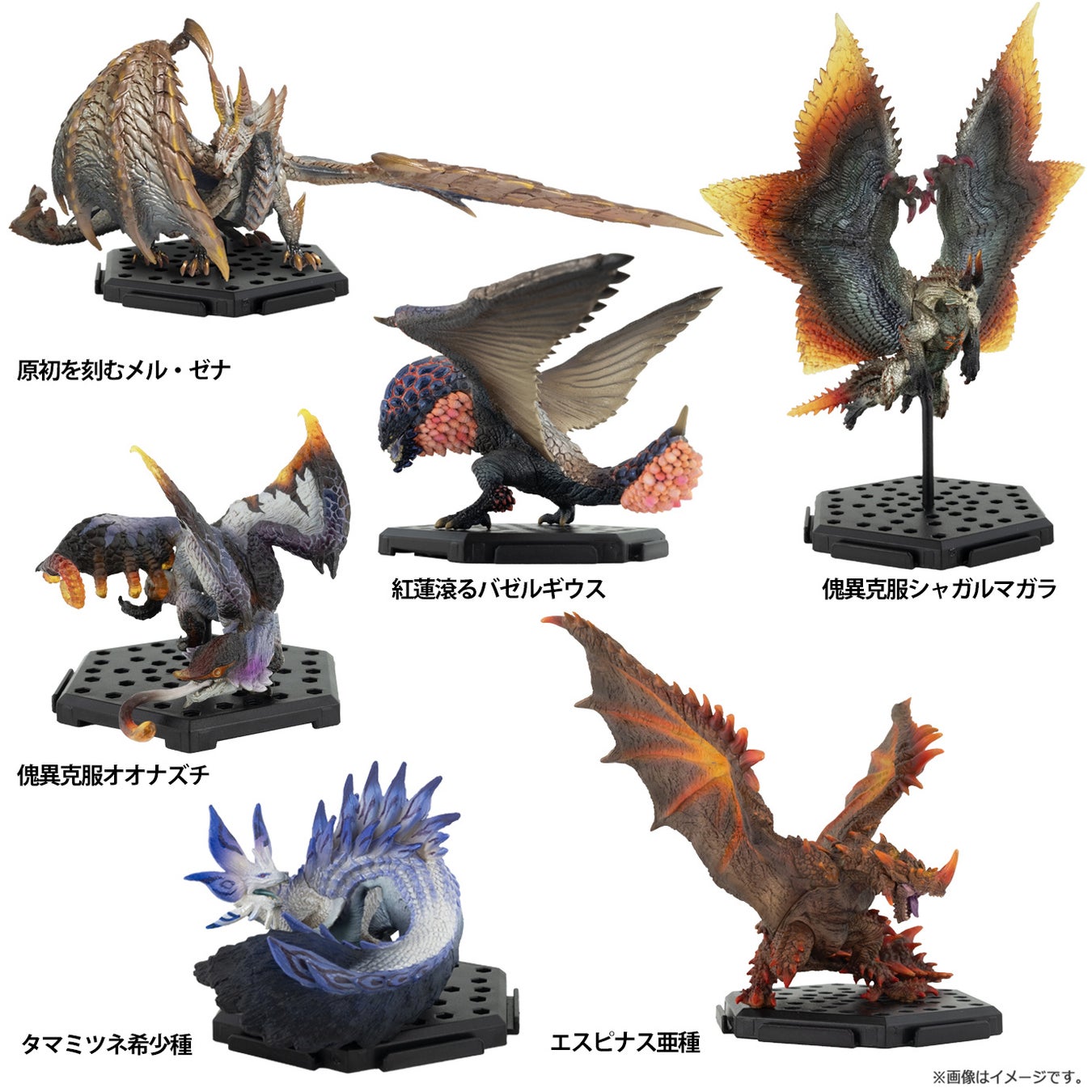 2体の新規造形モンスター「原初を刻むメル・ゼナ」、「紅蓮滾るバゼルギウス」が満を持して収録!傀異克服モンスターは全身にクリアパーツを採用することで、作中の姿を再現。プレーヤーから高い人気の「タマミツネ希少種」、「エスピナス亜種」などラインナップすべてが通常と異なる姿に! ボーナスパーツを集めると、炎をイメージしたカラーリングの「怨嗟響めくマガイマガド」が完成、1個箱毎に1枚封入されているモンスターアイコンのステッカーも健在。ぜひご購入を!