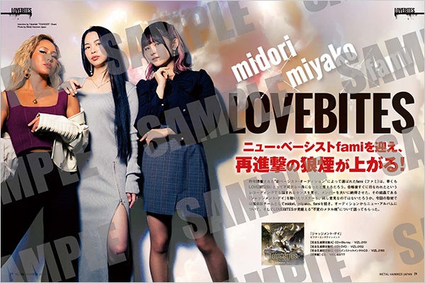 ニュー・ベーシストfamiを迎え、新生LOVEBITESが最新作『ジャッジメント・デイ』を発表。本人の声を借りれば、本作は“何が変わり、何が変わっていないのか”、そして“自分たちのメタルへの想い”をジャッジしてもらう一枚になったという。今回は弦楽器チームとしてmiyako、midori、famiを迎え、オーディションからアルバム制作、そして今後の動きについてじっくりと話を聞く。