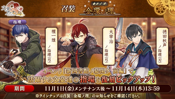 召装『金環ノ理』のラインナップを更新いたしました。この召装では、新イベント『文史紀伝「新図書館ノ幕開ケ 前編」』で活躍する「太宰治」「檀一雄」「徳田秋声」の指環を一定の確率で入手できます。
