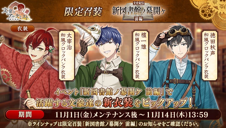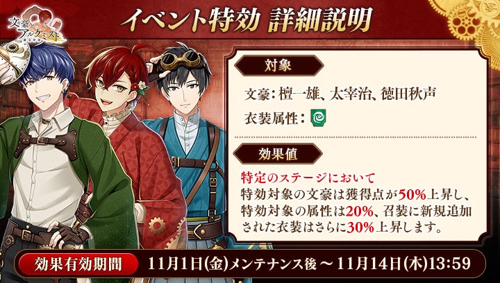 さらに、イベントと同時に開催される限定召装『新図書館ノ幕開ケ 前編』にて新規追加された「太宰治」「檀一雄」「徳田秋声」の〈和風クロックパンク衣装〉を編成すると、得点の獲得率がそれぞれ30%上昇します。