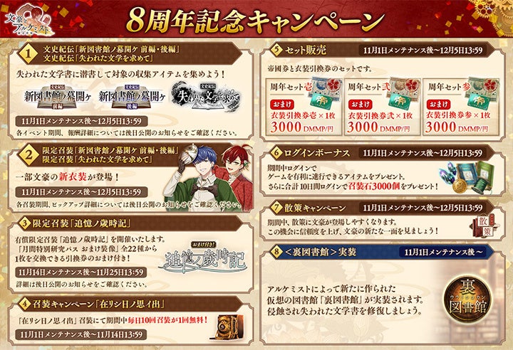 DMM GAMES『文豪とアルケミスト』新イベント『文史紀伝「新図書館ノ幕開ケ 前編」』開催!8周年記念キャンペーン開催のお知らせ
