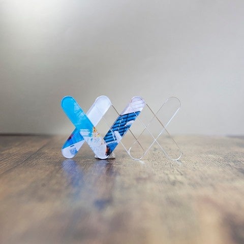 こちらの作品はアクリルと写真を貼り合わせて、×××の並びが特徴の立体的でスタイリッシュなブローチに仕上げました。