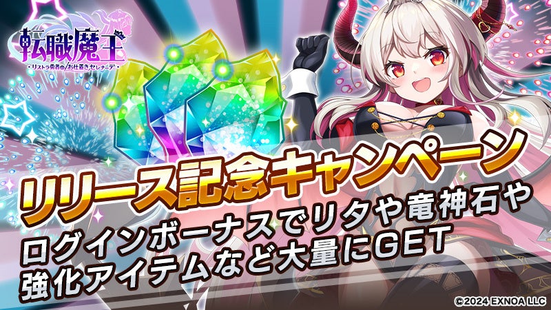 『転職魔王』のリリースを記念してキャラクター「リタ」や「竜神石」、さらに強化アイテムが大量に手に入るログインボーナスです。