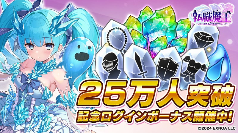 『転職魔王』のユーザー数が25万人を突破したことを記念して、キャラクター「ジャニーヌ」や「竜神石」、さらにキャラクター・装備強化アイテムがもらえるログインボーナスです。