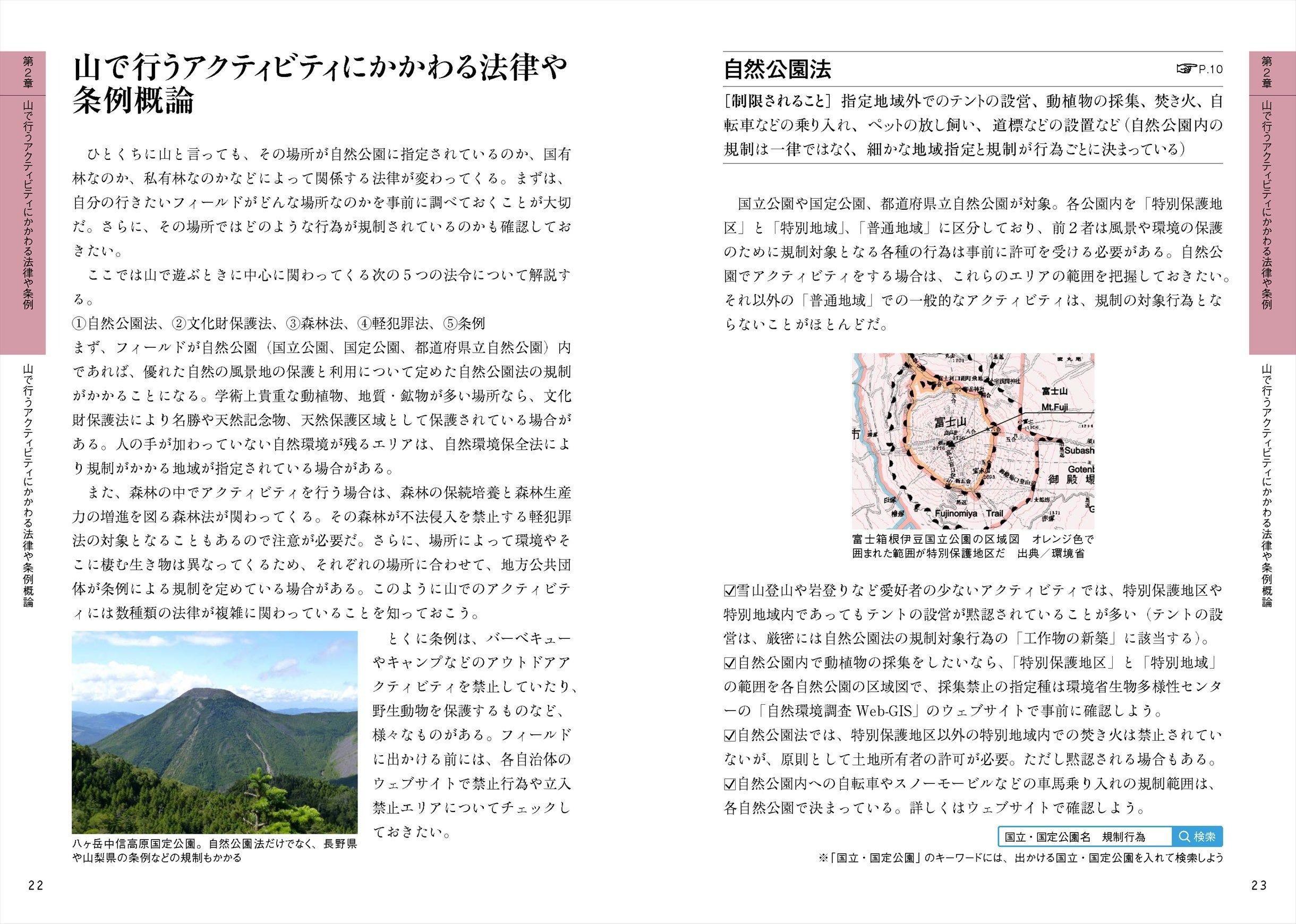 各章の中でも、さらにそれぞれのアクティビティごとに関係してくる法律をまとめています。例えば、第2章では「登山・ハイキング・トレイルラン」「クライミング・ボルダリング」「キャンプ・焚き火」「バックカントリースキー・スノーボード」「オフロード自動車・オフロードバイク・MTB・スノーモービル」「その他の山のアクティビティ」に分けて解説。