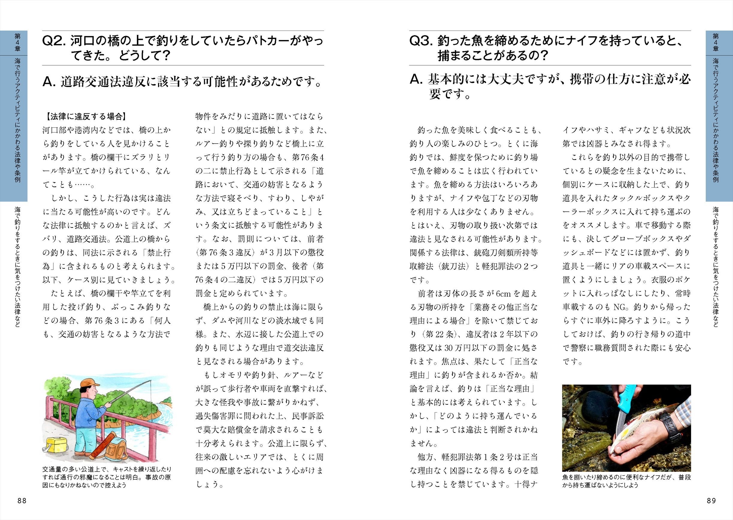 「テン場以外でテントを張るのって違法なの?」「河口の橋の上で釣りをしていたらパトカーがやってきた。どうして?」など、アクティビティ中にふと思い浮かぶような疑問は、Q&Aとして詳細まで分かりやすく解説しています。