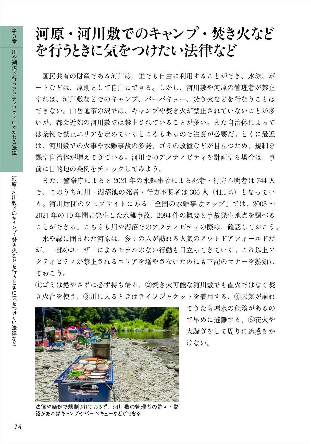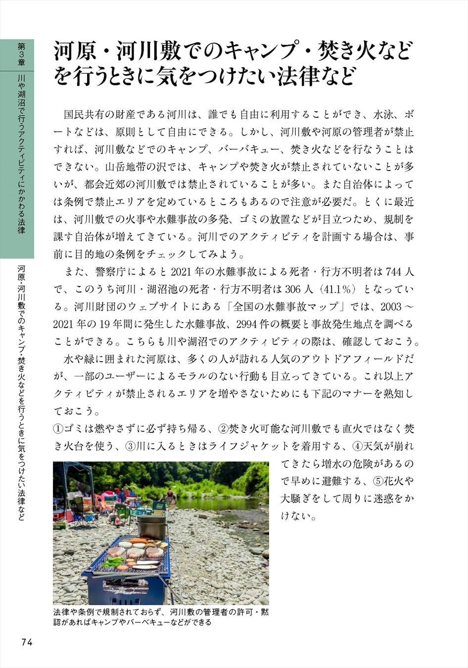 この本では、少しでも分かりやすくするために、フィールド別に「山」「川・湖沼」「海」「都市近郊・公園」の4章に分け、それぞれの場所に関係する法令の解説をしています。加えて、どうしても発生してしまう「事故」に関する法令を別の章として設置しました。