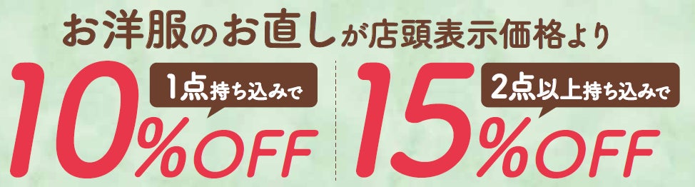 洋服のお直し2点以上持ち込みで店頭表示価格より15%OFF。