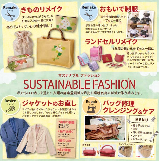 洋服のお直し、バッグ修理・バッグクレンジング&ケア、ランドセルリメイク、おもいで制服、きものリメイク、ネーム刺繍、ペット服のお直し・リメイク、スーツケースのキャスター交換修理。